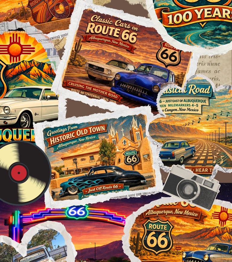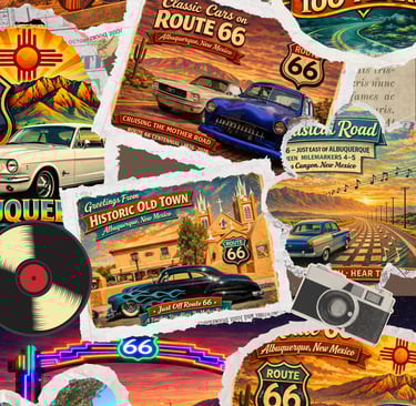 Vintage Route 66 artwork, New Mexico inspired postcards, and classic car merchandise